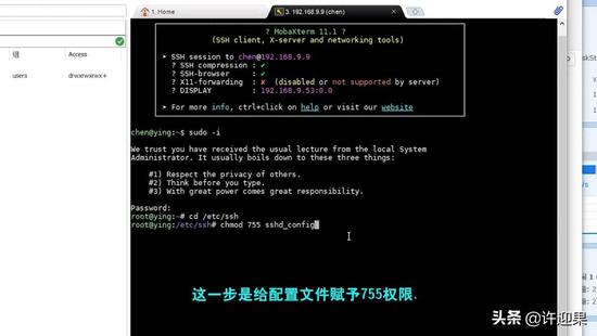 再输入chmod 755 sshd_config,755前后都有空格,这一步是给配置文件赋予755权限.