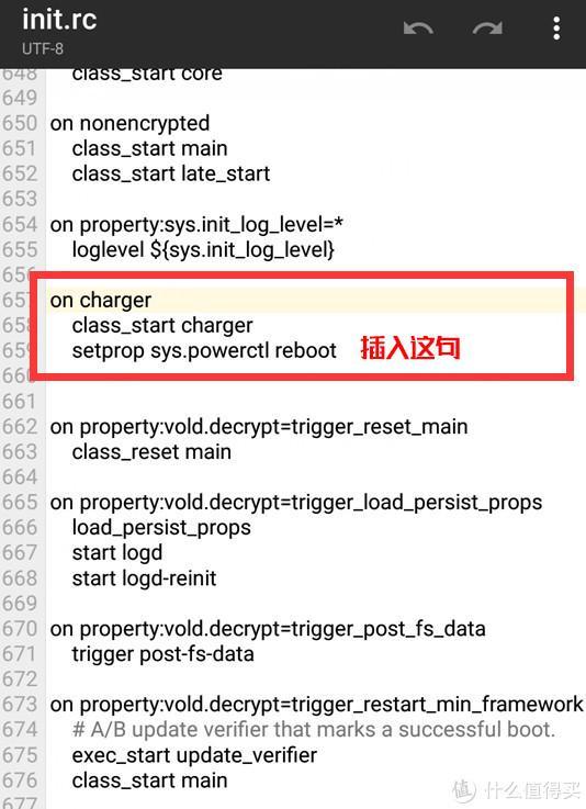 用MT管理器2.0打开“手机内置储存ImageFactoryunpackedboot.img_unpackedramdiskinit.rc”,搜索关键词“charger”,找到下面代码,插入下一句。