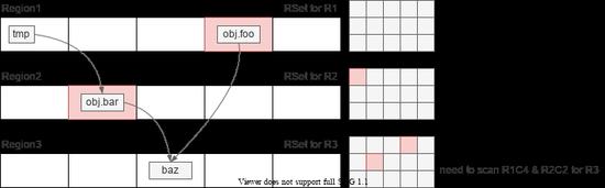当然,RSet 的具体实现和上图不太一样,如一般用 HashMap 来存储;但如果 region 里的 card 数过多就会退化成 bitmap;引用的 region 过多,则 region 也会用 bitmap 来存储。细节上也有很多优化,比如 barrier 的更新是先记录到一个 Thread Local 的队列上,异步更新到 RSet 中的。