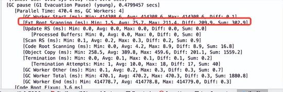 总共花了0.4573432秒,共8核并行执行。仔细,看这些数据,发现有一处很不合理,就是上面红色的那一行字。 Ext Root Scanning堆外部根扫描,总共花了596ms,其中最高448ms ,要知道这次ygc也才花457ms,几乎把所有时间都花在这个Ext Root Scanning。