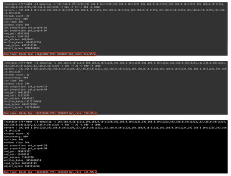我们看到,在 60 秒的测试时间内,两台客户机总操作数超过 2.3 亿条,测试机每秒的操作数最高可以超过 380 万 TPS,这凸显出分布式内存对象缓存强大的处理能力。