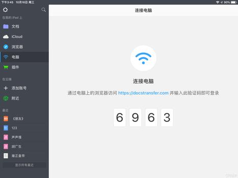 利用Documents,用户可以无需使用数据线,而达到与电脑互传文件功能。用户只需要使用Documents的“电脑”功能,获得4位数的随机连接码,然后进入,输入连接码,就能在电脑的浏览器(推荐使用Chrome浏览器,部分浏览器无法使用上传功能)中上传或下载iOS设备中的文件。