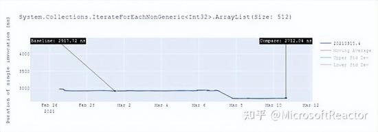 此图像演示了不稳定的性能测量,其中性能在连续运行中在慢速和快速之间波动。x 轴是测试日期,y 轴是测试时间,以纳秒为单位。到图表末尾(提交这些更改后),您可以看到测量值稳定,结果最好。这张图片展示了一个单一的测试。还有更多测试在dotnet/runtime #43227中被证明具有类似的行为。