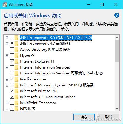 作为Windows系统的一项主要特性,系统内置的.NET Framework可通过控制面板中“程序和功能”窗口左侧的“启用或关闭Windows功能”链接进入选择并开启,自动下载和安装(图5)。