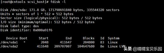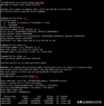 最后,执行fdisk -l发现磁盘已经由100GB 扩容到171GB,系统已经成功识别新增加的磁盘空间,整个过程并没有重启过。