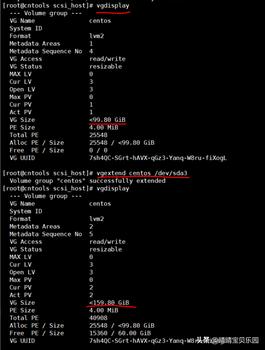 执行vgextend centos /dev/sda3 将刚才新建的sda3添加到VG中,之后再次查看vgdisplay后,可见容量已经变为159.8GB.