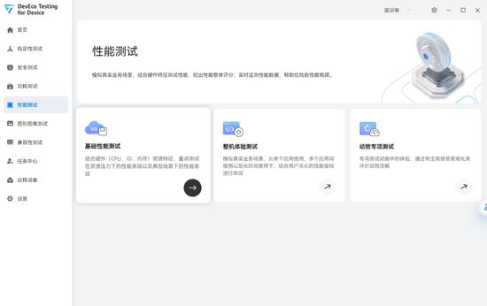 顺利下载、安装、登陆华为账号之后,我们就进入了 DevEco Testing 的主界面。可以看到,这里的左侧菜单栏有非常多的测试可以选择,坦白说,笔者在第一眼看到左侧这么多项目的时候还是非常惊喜的,毕竟这可比 PerfDog 的功能多了太多,如果 DevEco Testing 在我们的测试里被证实可用,那它说不定还能以免费的姿态完全替代 PerfDog。