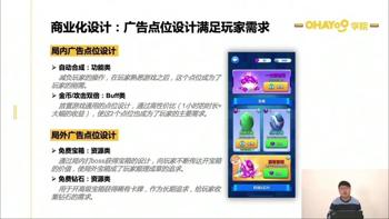 局外广告点位的设计,我们主要是设计成为资源类的,包括免费宝箱以及免费钻石。免费宝箱的设计其实是局内的展示或反馈相结合,游戏中大概每过5-10关会有一个BOSS,打完BOSS玩家会获得宝箱,宝箱中会开出各种卡牌碎片甚至是成品炮塔的卡牌,通过这种方式,持续向玩家传达开宝箱的价值,使得玩家对于开宝箱形成概念,局外的宝箱也会成为玩家顺利成章的追求。而免费的钻石同样也是依托于宝箱的这套体系,高级宝箱会产出稀有的卡牌,而高级宝箱需要玩家积累钻石开启,所以这个会作为玩家中长期的小追求。