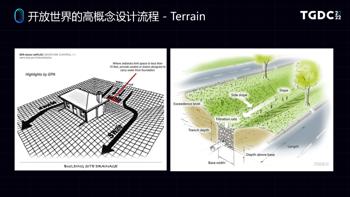 设计制作一个真实可信的地形,有不同的方式方法。举一个简单的例子:排水引流或坡度。场地如何排水的概念,对于让设计真实可信是非常重要的一点,因为它在生活中无处不在,即使我们自己觉得最“平坦的空间”,实际上也是为了排水引流而设计的。