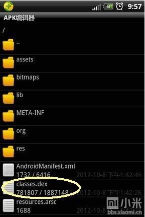 5,保存完毕后,返回程序列表,会发现多了一个同名文件(蓝圈),但后缀名是”.apk.bak”,它是原始的APK备份文件,也就是没有经过编辑的APK文件,只要把后缀名“.bak”去掉,它就会变成原始的APK文件了!在安装、运行编辑后的APK程序无问题时,就可以把备份文件删除了!
