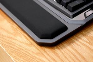 键盘标配了腕托,组装后与键盘的契合度非常高,无卡扣式的组合方式,拆装都较为便捷,腕托的材质为ABS加冰丝织物,内里填充的是记忆海绵,手感软弹同时又有很好的衬托感,冰丝的加入让手感亲肤且更顺滑,长时间使用能够有效的缓解疲劳感▼