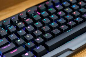 在键盘的左侧位置设置了独立的RGB灯条带,配合驱动软件可独立设置灯效显示,另外在外围的两侧也加入了L型的灯饰,配合键位的灯效显示让整个键盘拥有更好的灯效显示的氛围感,这一点对于喜欢RGB灯效的用户来说正中下怀▼