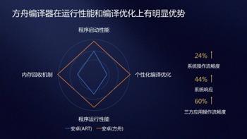 安卓自身的编译技术在不断的发展,但始终需要在运行中依赖虚拟机来进行动态编译和解释执行,对系统资源消耗较大。而方舟编译器在开发环境中就可以完成全部代码的编译,手机安装应用程序后无需依赖虚拟机资源,即可全速运行程序,带来效率上的极大提升。举一个例子:EMUI 9.1仅仅对系统组件System Server应用了华为方舟编译器后,就带来了系统操作流畅度提升24%,系统响应性能提升44%的收益。