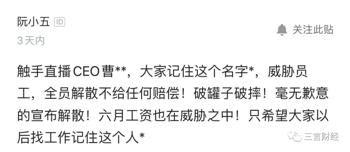 还有认证为触手直播运营的网友发帖称,触手直播近期将停服,要求员工主动提离职,还为了不给赔偿“打感情牌”。
