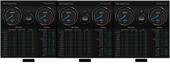 Macbook Pro的c口是雷电接口,通过软件直接测试的结果出乎意料,直插速度竟然比转接速度还要低一些。速度算是正常速度,毕竟这些标称的速度在实际使用时都是有损耗的。Aigo标称是500M/s+的传输速度,实际跑出来通过hub c口的测速结果最高。