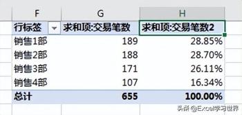 7. 根据需要分别修改 G 列和 H 列的标题,H 列就是每个部门占总计的比例。
