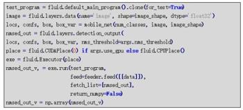 模型训练完成后,用test_program = fluid.default_main_program.clone(for_test=True)将Program转换到test模式,然后把要预测的数据feed进Executor执行Program就可以计算得到图像的分类标签、目标框的得分、xmin、ymin、xmax、ymax。具体过程如下: