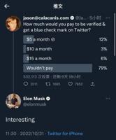 杰森・卡拉坎尼斯(Jason Calacanis)发起了一场推特投票,询问人们能接受为推特认证蓝标服务花费多少钱,他提供了每个月5至15美元的选项。但截至10月31日下午4点30分,记者看到,在超过53万次的投票中,有79%的用户都不愿意付费,只有12%的用户选择了每个月可以支付5美元。