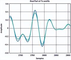 首先,在时域中绘制规范化的发射器和接收器数据。用户可以放大图形来观察发射器和接收器的对齐状态。这里只显示了数据的实部,但用户也可轻松绘制虚部。实部和虚部通常应该对齐或不对齐。