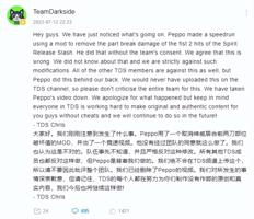 7月12日,TDS的管理者、德国玩家Chris,使用B站官号发布中英双语的道歉声明,称Peppo的行为“没有经过团队的同意”,团队事先并不知情,且严格反对这种修改。