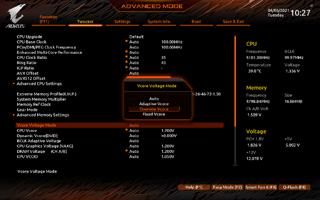 给处理器超频当然少不了手动调节核心电压的步骤,技嘉钛雕Z590 AORUS TACHYON的核心电压设置提供了自动(Auto)、自适应(Adaptive)、覆盖(Override)和固定(Fixed)几个模式。对于手动超频玩家来讲,比较常用的是覆盖模式,它也会受到防掉压设置的影响。