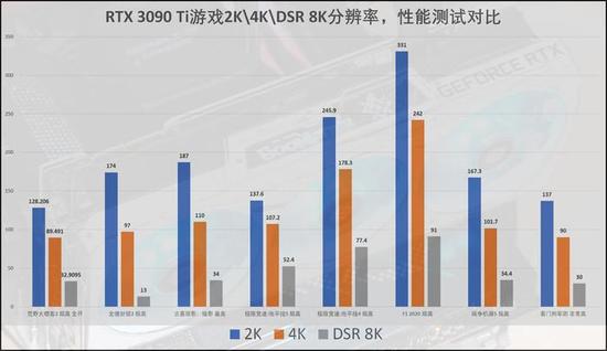值得注意的是,刚才我们的对比表格里是不算上NVIDIA DLSS功能测试,DLSS2 Performance 8K项目,有着12GB显存容量的RTX 3080 Ti直接在此测试项中爆显存,性能自然是不具代表性。另一方面也证明了,若想在8K分辨率下开启DLSS玩游戏,没有RTX 3090 Ti或者是RTX 3090这级别的显卡是不行的。