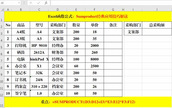 公式=SUMPRODUCT((D3:D12=I3)*E3:E12*F3:F12)中,有三个数据区域,分别为D3:D12=I3、E3:E12、F3:F12,当D3:D12区域中的值和I3单元格中的值相等时,返回1,否则返回0,然后三个数据对应元素先乘积,再契合,从而计算得到相应部门的总采购额。