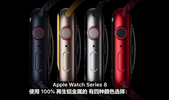 在配色方面,新款AppleWatchS8使用100%再生铝金属,拥有四款颜色,分别是深空黑、金色、银色以及红色。S8还有着不同材质款型:不锈钢款(有着银色、金色、石墨色)。