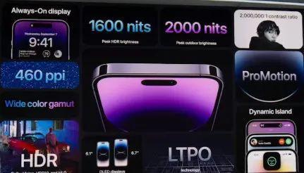 而在iPhone 14 Pro以及iPhone 14 Pro Max上,最大的闪光点就是这两款机型不仅支持最高120Hz的刷新率,且新的显示屏直接拥有1600尼特的HDR峰值亮度,最高可达2000尼特峰值!在所有智能手机中拥有最高的峰值亮度,屏幕可以根据相对应显示的内容进行1-120Hz的自适应调节,达到节能省电效果。