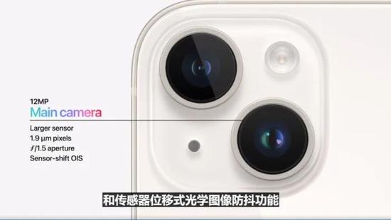 iPhone 14和iPhone 14 Plus拥有全新的1200万像素主摄,以及1.9μm的更大像素尺寸、f/1.5光圈,辅以传感器位移式光学图像防抖功能,历代最大的感光元件以及光学防抖技术让14系列两款机型在低光拍摄得到了49%的提升,且夜间模式的曝光速度提高至2倍。