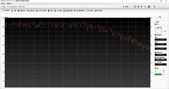 最后则通过负载更高的HD Tune Pro进行40GB大小的超大文件传输模拟,虽然根据机械硬盘的设计,不可避免的会出现读写随时间下降的问题,但在RAID 0模式下的平均读写也均达到了331.4MB/s,RAID 1模式下则为180.2MB/s和185.7MB/s。