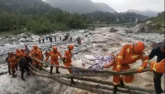 甘孜州森林消防支队雅江大队一中队搭临时木桥运送重伤者。受访者供图