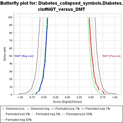 Butterfly plot显示了基因等级与排名指标评分之间的正相关(左侧)和负相关性(右侧)。左侧蓝色虚线和右侧红色虚线是真实的信噪比结果,其他颜色的线是软件对数据做了随机重排后的结果。默认情况下,图形只显示前100个基因,也就是排名第一和最后100个基因。可以使用运行GSEA页面上Advanced fields处的Number of markers来更改显示的基因数量。