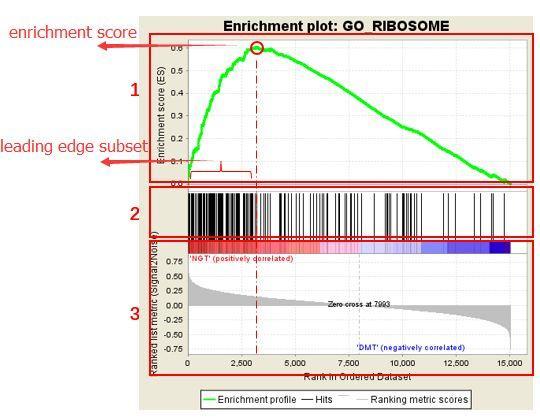 gene list相关性图如下。横坐标是已经排序好的基因,纵坐标是signal2noise的值。虚线左侧的基因是在NGT中高表达,右侧的基因在DMT中高表达。这部分结果报告中的面积比就是基于该图计算的,可以看出面积百分比和基因数目百分比有一定的差异,面积百分比可以从整体上反映组间信噪比的大小。