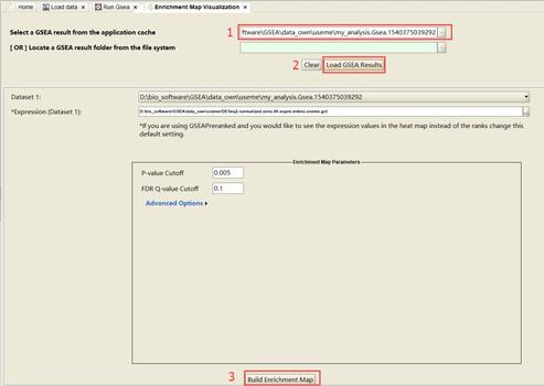 选择一个GSEA分析结果,点击Load GSEA Results,其他项为默认值就行,点击Build Enrichment Map以展示基因富集结果的网络图。(备注:GSEA分析结果用的是和上面演示数据不同的文件,可自行更改)