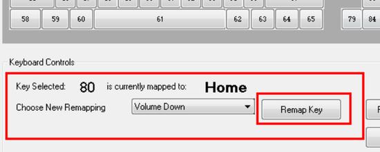 4.来通过一个实例来介绍如何操作吧:如果想把“Home键”映射为“增加音量”该怎么设置呢?先把鼠标点在80按钮上,也就是Home键,可以看到在下方已经有英文提示了。然后在下面的下拉列表中,选择Volume Down(音量减少)。然后点击Remap Key(映射键),就可以把Home键映射为音量减少功能。
