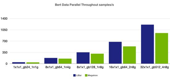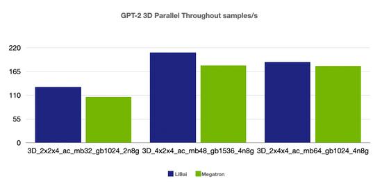 从上述性能对比数据可以看到,在严格对齐的实验环境下,在 Bert、GPT-2 模型上,LiBai 的训练速度全方位超过 Megatron-LM。