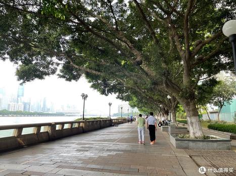 我常跑的路线,大概有60%的路段都有树木遮蔽相当一部分的天空。之前在使用fenix5的时候,虽然不常见,但是这些路段会出现随机的定位漂移,有时候能有定位点飘到几百米之外,导致分段配速相当异常。截取不同设备不同模式下相同一段的路程对比一下,实际环境是上面第一张照片,头顶树木茂盛,半边天空基本不可见(广州的滨江路中大北门至广州大桥一段,理想还原轨迹形状应该是几段长距离顺滑的弧线):