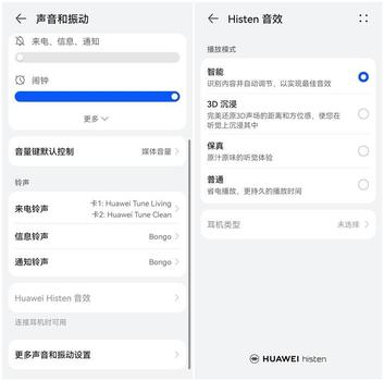 听歌的时候对音质不满意,可以打开华为自带的Histen音效,有四种播放模式可以选择,还可以根据耳机类型进行选择。在【设置】中,打开【声音和振动】,就能进行调节。
